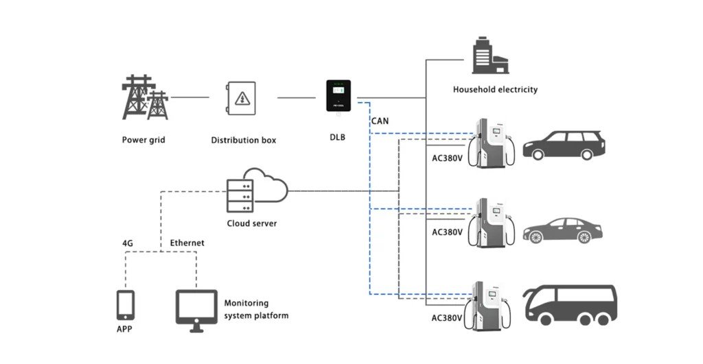 1. Dynamic Load Balancing(DLB): A system that dynamically balances charging power with your site’s total electrical capacity to help you avoid costly upgrades. Dynamic Load Balancing (DLB) is a technology or strategy for achieving dynamic load distribution, which can effectively optimize the allocation of power resources in commercial charging stations.