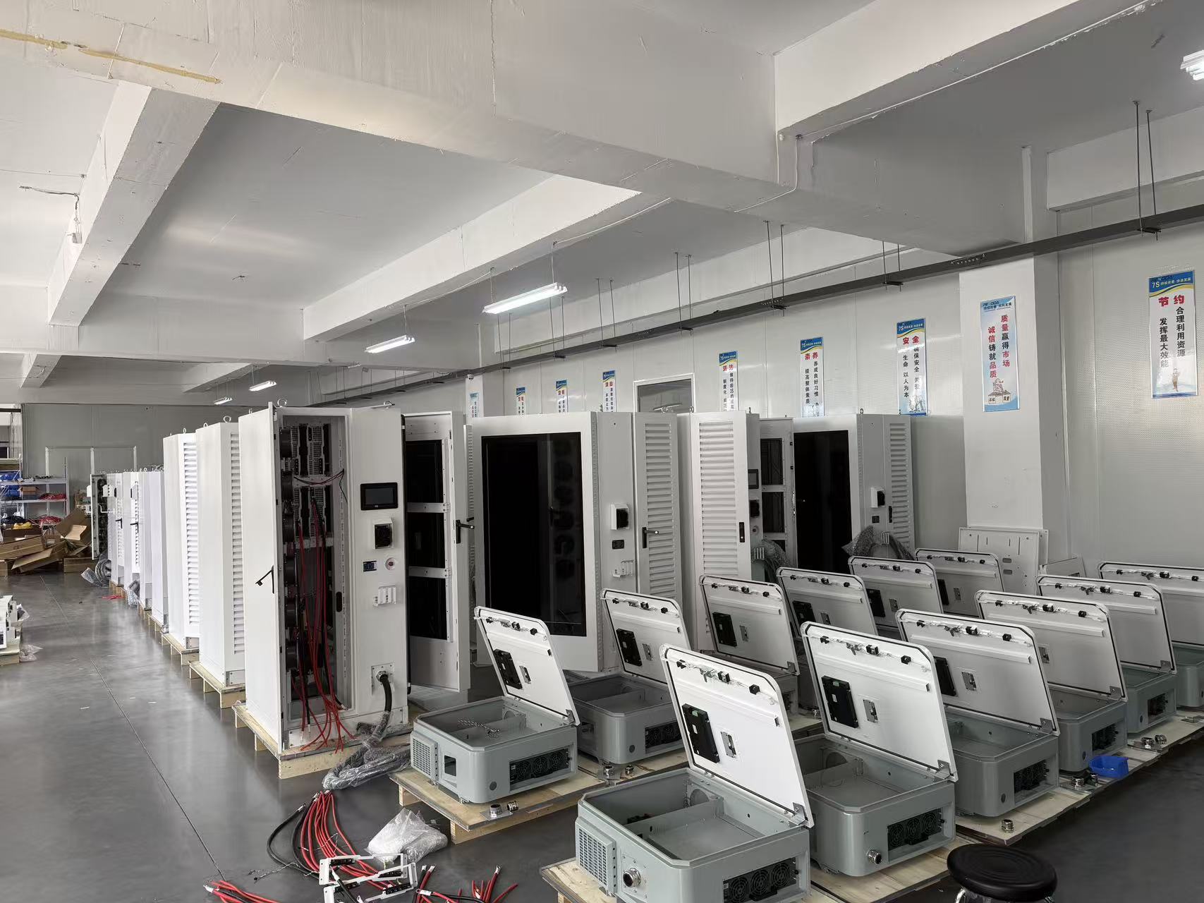 Every unit at Penoda undergoes a rigorous manufacturing lifecycle, as evidenced by the "open-frame" and "cabling" stages visible in the production hall: