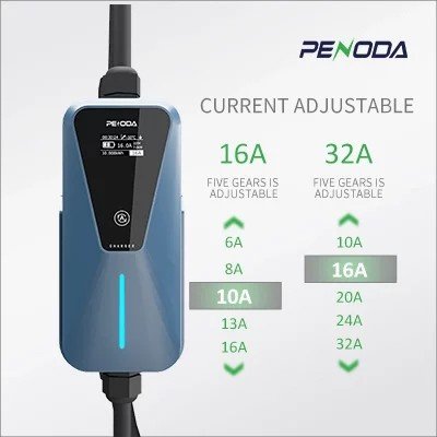 The charging current can be adjusted via touch buttons to match different household power limits, preventing circuit overloads while traveling.